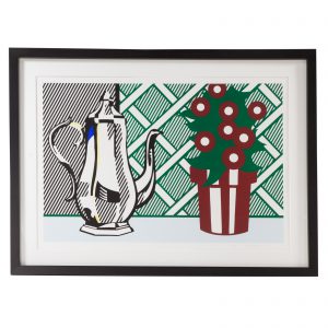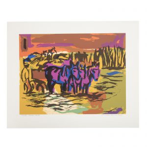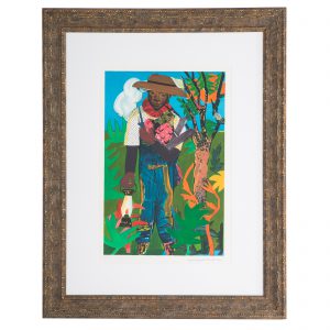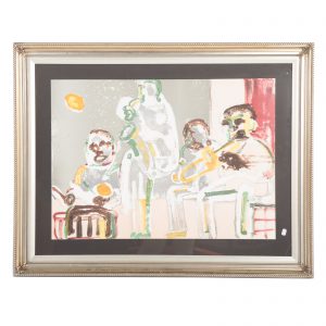 Varnette Honeywood’s piece, “Like Father, Like Son,” (lot 910) is an ink signed and titled lithograph of the original mixed media piece. The work portrays the family of fellow artist, Romare Bearden (who’s work also appears as lots 829, 887) and is famous for being on view in the living room of the long running hit, The Cosby Show.