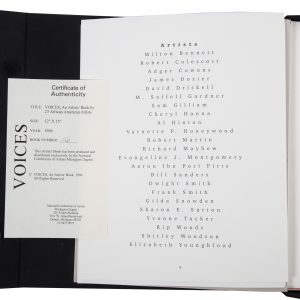 Lot 912 presents a remarkable collaborative piece, “Voices,” featuring the likes of EJ Montgomery, Sam Gilliam, Shirley Woodson and Varnette Honeywood. The archival box contains twenty-three original works on paper and was produced and distributed exclusively by the National Conference of Artists, Michigan Chapter.