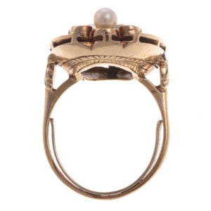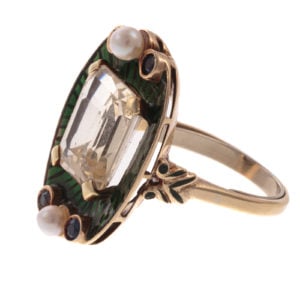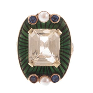 Say “I Do” to lot 144. For the person looking for unique twist on an engagement ring, or just a fabulous cocktail ring, look no further. The emerald-cut, light yellow citrine is beautifully set in a green and black enamel frame with four round bezel set sapphires and two pearls.