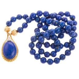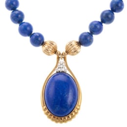 Pantone’s 2020 color of the year Classic Blue 19-4052 makes an appearance in lot 187. This bold pop of color has a beautiful gold pendant, with a bezel set smooth polish lapis, six round cut diamonds and two fluted high polish gold beads.