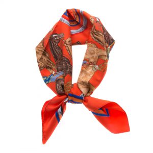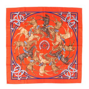 Orange and multi-color 90 cm silk scarf with ”La Ronde Des Jockeys” motif and hand rolled edges, in the original box.