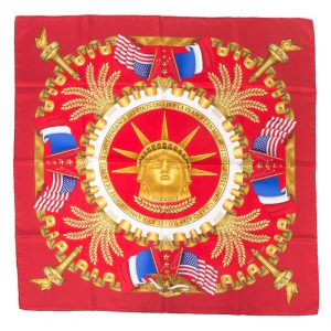 Red and multi-color 90 cm silk scarf with ”Liberty” motif and hand rolled edges, in the original box.