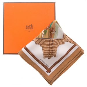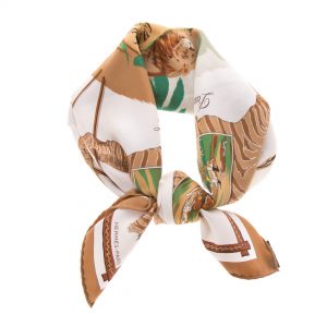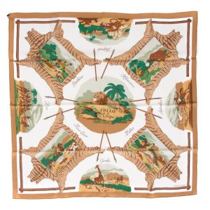 Ivory and multi-color 70 cm silk scarf with ”La Chasse en Afrique” motif and hand rolled edges, in the original box.