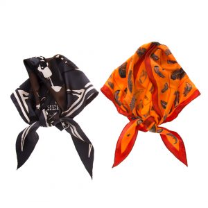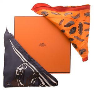 2) Orange and multi-color silk triangle scarf with “Plumes” feather motif and hand rolled edges, in the original box.