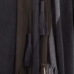 Gris merino wool and cashmere “Rocabar” poncho with leather tassel closures. Measures 62″ x 59,” in the original box.