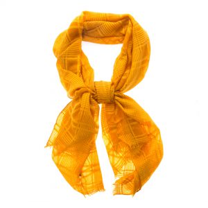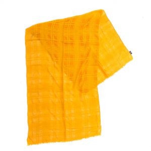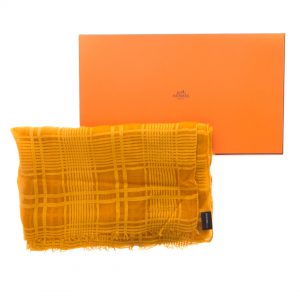 Fringed cashmere and silk muffler in mustard with fringed edges, measures 28″ x 79,” in the original box.