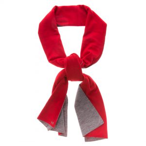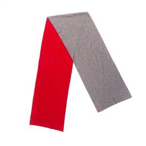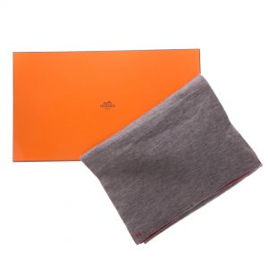 Red and grey “Aller-Retour” cashmere and silk scarf, measures 11.8″ x 71,” in the original box.