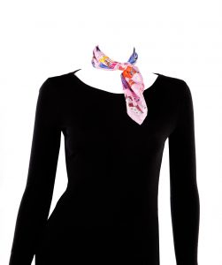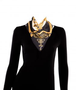 1) Charcoal and multi-color silk triangle scarf with “Aleche Elastique” motif and hand rolled edges, in the original box.