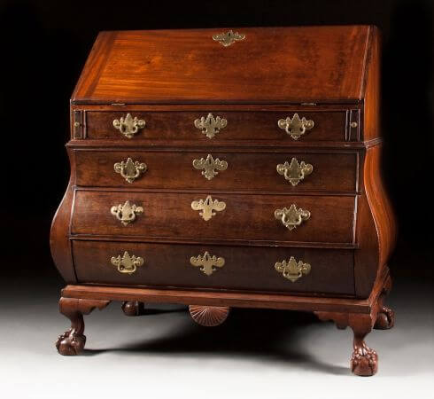 18th Century Piece of Furniture: Chippendale mahogany bombe cased slant-front desk, attributed to Benjamin Frothingham, Charlestown, Mass., circa 1760. Sold for $32,450.
