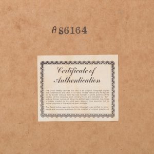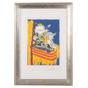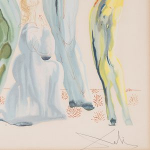 This lot offers a very vibrant color lithography depicting the religious scene of the conception of Jesus. The Madonna image in the piece is taken from the sculpture, “The Blessed Ludovica Albertoni,” by Bernini. This piece is more representative of what we think of when we think of Dali. The eye-catching lithograph is pencil signed.