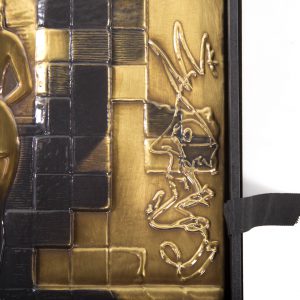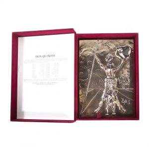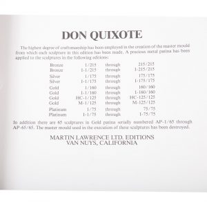 This Martin Lawrence limited edition, (hors commerce ed. 102/125) metal bas relief depicts a figure on a horse carrying a shield and spear (Don Quixote). Whimsical and unusual, it is presented in a lined box.