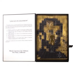 “Lincoln in Dalivision” was created in a way that only Salvador Dali could have imagined. At first, one sees the image of Gala looking into the horizon, but upon stepping back from the piece, a new image appears and the piece transforms into the portrait of Abraham Lincoln. This is a conversation piece for sure and is presented in a lined box.