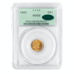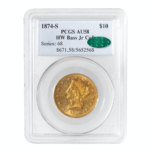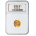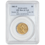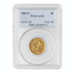 The 1866-S $5 NGC MS62 (lot 611) carries the wonderful provenance of Louis Eliasberg, Sr., going back to 1907. This Baltimore financier accomplished in 1950 a feat previously unknown in numismatics—the formation of a collection of all copper, silver, and gold US coins minted from 1792 to 1950. Only one other coin at NGC carries a higher grade (63) than this coin, but it doesn’t have the same pedigree. The $5 Half Eagles have great dates and scarcity, including coins such as the 1811 Capped Bust PCGS MS-64 CAC Tall 5 variety (lot 616). Third finest known, a 209-year-old gold coin in this level of preservation and grade is exceptionally rare. Our 1861-C PCGS AU53 (lot 620) is the last coin minted at Charlotte, and some 800+ had been made by the Confederacy when the Union Army captured the mint.