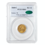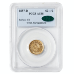 The $2.50 Quarter Eagles are also nicely represented by rarity and exquisite grades. The first six coins are of Charlotte and Dahlonega mintage, highlighted by an 1857-D PCGS AU58 (lot 609) and an 1860-C PCGS MS61 CAC (lot 610). The 57-D has a tiny mintage of 2,364 and is scarce at all levels of preservation. The 60-C is one of four MS-61s, which makes it the finest known at PCGS and the only mint-state 60-C with CAC status.