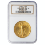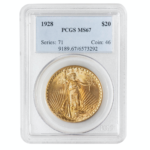 In 1907, President Teddy Roosevelt, believing that all American coins were poorly designed and not representative of great art, asked Augustus St. Gaudens to redesign all American coin types. St. Gaudens was able to finish only the $20 and $10 Indian before he passed away later that year, but what a legacy he left. The first 1907 Double Eagles were made in High Relief and were later redesigned in lower relief because, even though they are quite beautiful, they were hard to stack. This NGC-66 High Relief Wire Edge (lot 630) is a gorgeous coin and quite valuable, as is the 1928 Saint—PCGS MS67 (lot 631).