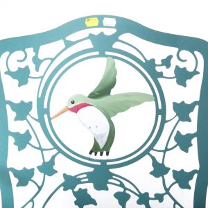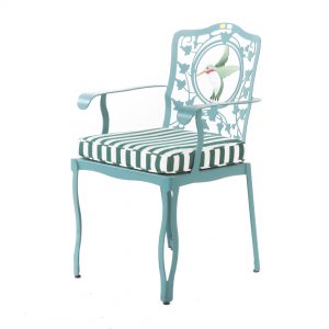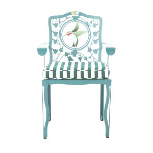 Loving the bright colors and whimsical hummingbird motif from lot 7205: A Contemporary Painted Metal Armchair. With bold striped upholstered cushions this playful chair is not to be missed. Added bonus – this char is very comfortable!