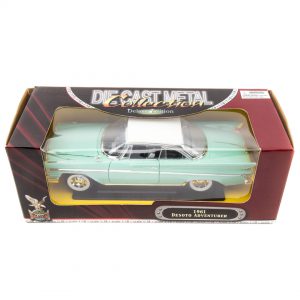 Sure to put a smile on any car collector’s face is lot 7381: 1/18 1961 DeSoto Adventurer (Green) Diecast Model by Road Legends. Fun fact, the term die-cast toy refers to any toy made by using the die casting method of putting molten lead or zinc alloy in a mold to produce a particular shape. Such toys are made of metal, with plastic, rubber, glass, or other machined metal parts.