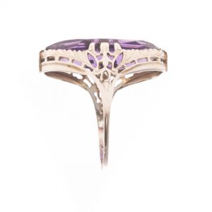 14K white gold vintage filigree ring with openwork, featuring a long, faceted oval amethyst.